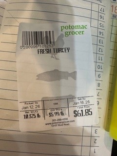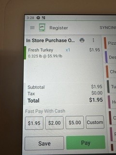 Grocer reported that her Clover app failed to scan items weighing over 10 pounds correctly. For example, a fresh turkey label showing 10.325 pounds at $5.99 per pound (total $61.85) with the barcode 0200996103253 would not parse properly. Instead, the system required manual weight entry, disrupting efficient checkout.